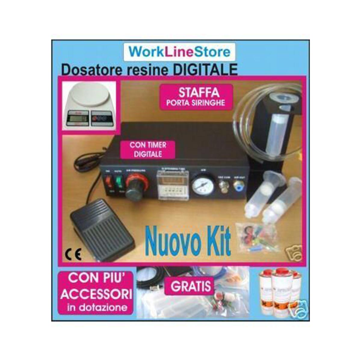 Il principio di lavoro è molto semplice, si utilizza la siringa come fosse una penna. La colata viene gestita tramite il sistema pneumatico della resinatrice, è possibile impostare un tempo predefinito di erogazione, oppure gestirlo manualmente. L'azionamento avviene tramite un comodo pedale, a fine ciclo il sistema di vuoto funge da salvagoccia evitando di sporcare.