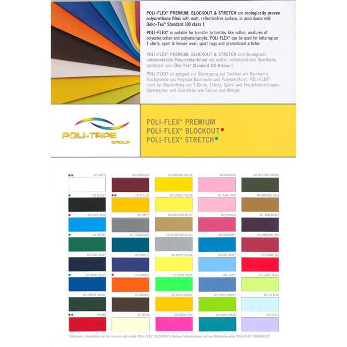 Flex termoadesivo in Poliuretano morbido e sottile, con liner PET adesivo. Adatto per il trasferimento su tessuti in cotone, misto cotone-poliestere e poliestere-acrilico.